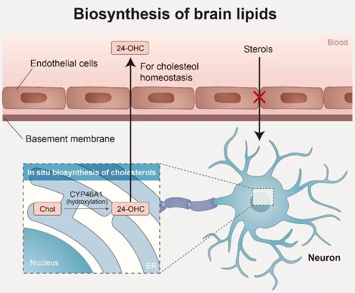 The brain contains about 25% of the body’s total cholesterol. Most of this cholesterol is produced by astrocytes and is transferred to neurons via cholesterol-rich lipoproteins, such as apolipoprotein E (APOE), where it supports the maintenance of axons and synaptic connections. In the brain, endogenous cholesterol is primarily found in the myelin sheaths, and the levels of unesterified cholesterol are significantly higher compared to other tissues. Only around 1% of brain cholesterol is esterified and stored within cells as lipid droplets, serving as a reservoir for excess cholesterol. The BBB largely restricts the exchange of sterols between the CNS and peripheral tissues, with less than 1% of cholesterol being exchanged daily. Consequently, brain cholesterol metabolism operates almost independently of the rest of the body. Maintaining proper cholesterol homeostasis is crucial for normal brain function, and disruptions can lead to neurodegenerative diseases and cognitive impairment in the elderly.
